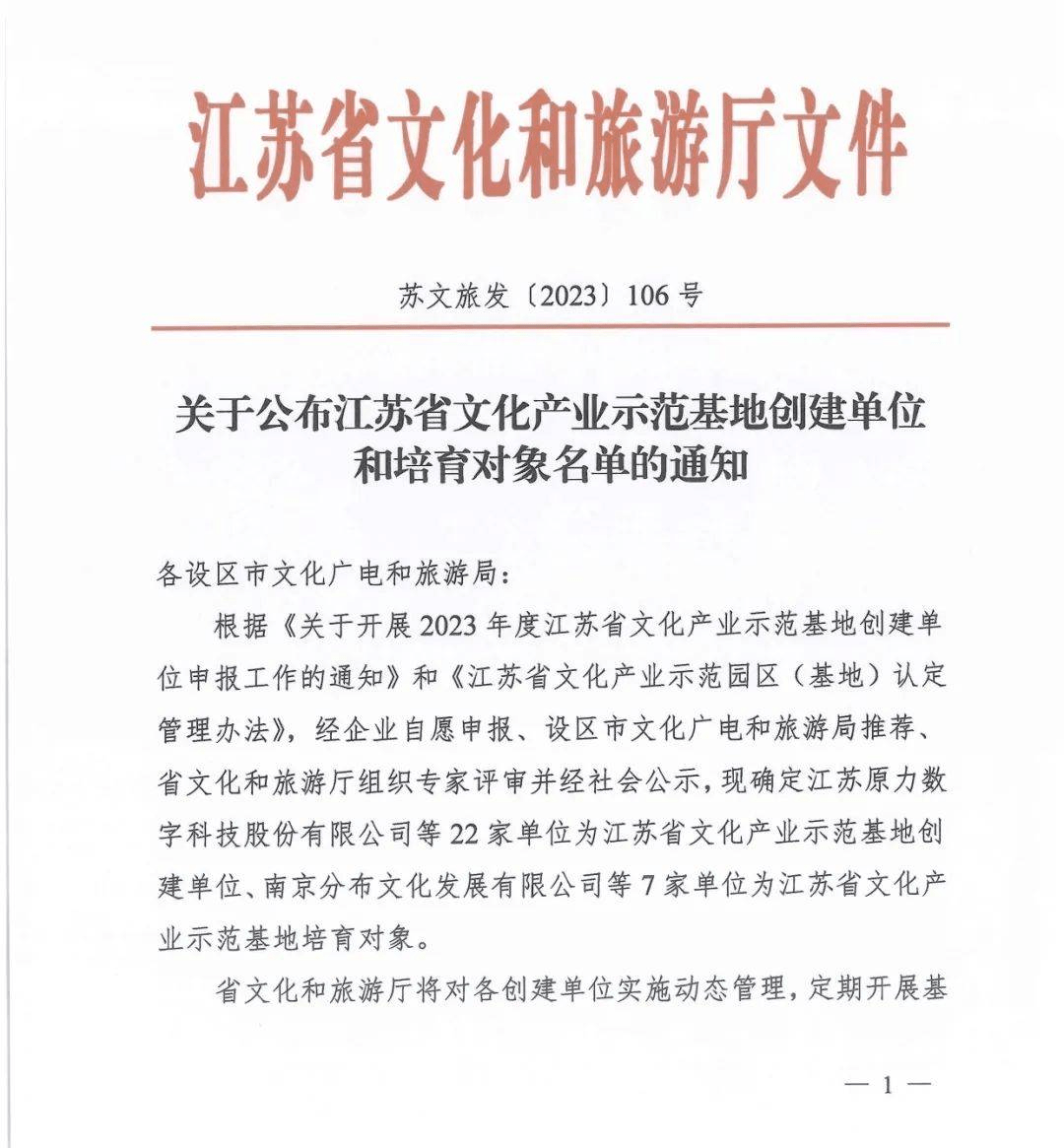 2023 年 11 月 10 日,江苏省文化和旅游厅公布了 22 家省级文化产业示范基地创建单位名单, 无锡共有3家单位成功入选,江苏凤凰画材科技股份有限公司名列其中(名单附后)。
