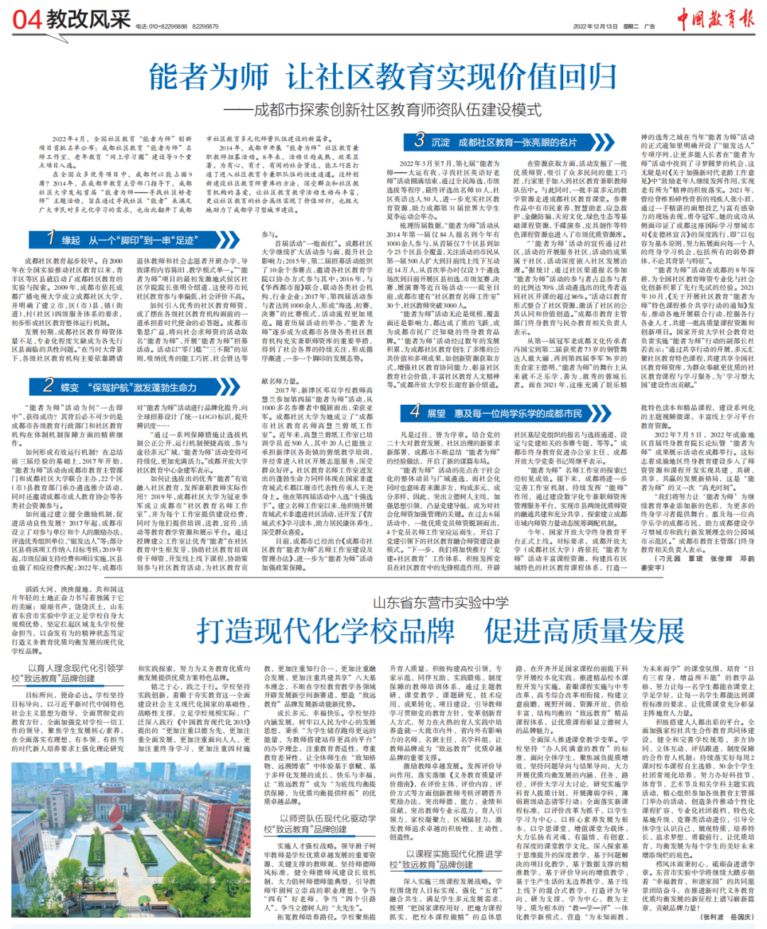 一、用教育教学质量大面积提升,回应群众对优质教育的热切期待 (一)坚持理念引领,促进教师专业发展新提升 五年来,总结提炼学科教学模式(方法)19种,成立了1个山东省名班主任工作室,2个东营名师工作室,12个校教学名师工作室、6个名班主任工作室;70余人获评省特级教师、市学科带头人等省市级荣誉,86人获评区名师、区能手称号。2022年度,省基础教育优质课评选获4个一等奖、1个二等奖、2个三等奖,获奖数列全省第一;13人获得市教学能手;13名教师获得开发区教学质量先进个人,5个学科获得教学质量优胜学科;《中国教育报》以《打造现代化学校品牌 促进高质量发展》为题对我校教改工作进行了深度报道。