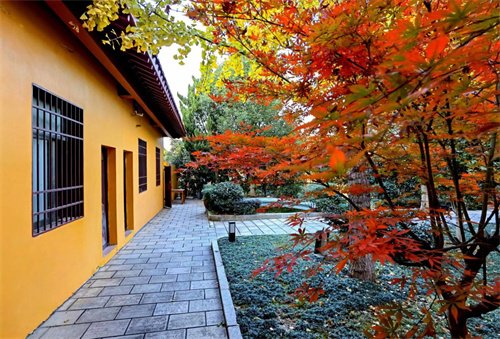 圣安寺内种有很多的樱花树,到了秋天,樱花树的叶逐渐变黄,寺院一下就被染上了金黄色。虽然樱树叶没有枫叶那样的红,但金黄色也是好看的,特别是与寺院琉璃殿宇同框而展现时,黄色的樱花叶与黄色的琉璃瓦互相辉映增色,形成了金色的世界,意境自然而生,引得骚人墨客打卡自拍。这两年古装兴起,每天好多着古装的小女孩走进寺院,整合着传统的服装与传统的建筑之间审美视角,发往朋友圈,让朋友分享圣安寺的美景。