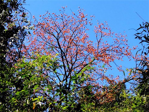 我刚来重建圣安寺时,有人建议在楞伽山上多种常青树,而我觉得对山上树加以保护便可,不需种同一树种。现在,事实印证,这个决定还真是保护生态的远见。因为这一决定,山上的杂树就有了机会。秋天的季节,山上杂木野树上满是桨果,此时的楞伽山更是成了各种鸟的天堂。山上的桨果,山上这份清净,人鸟一如,谁愿意过惊涛骇浪或者饥寒交迫的日子呢?无论人也罢,飞禽走兽也罢,住在山上应是很惬意的。山上的野桨果,不仅使得楞伽山充满了生机,而满山遍野的秋叶更是让人赏心悦目。那些红红的、黄黄的果实我道不出它的名字,但我还是认识野柿树的。秋天的野柿树上,密密麻麻挂满了小柿子。深秋的柿树,叶子掉得差不多了,树上几乎只剩下红黄相间的果实,与宝塔一道打卡拍照,吉利而鲜活的场景,让人过目不忘,铭记心脑。 ![]()