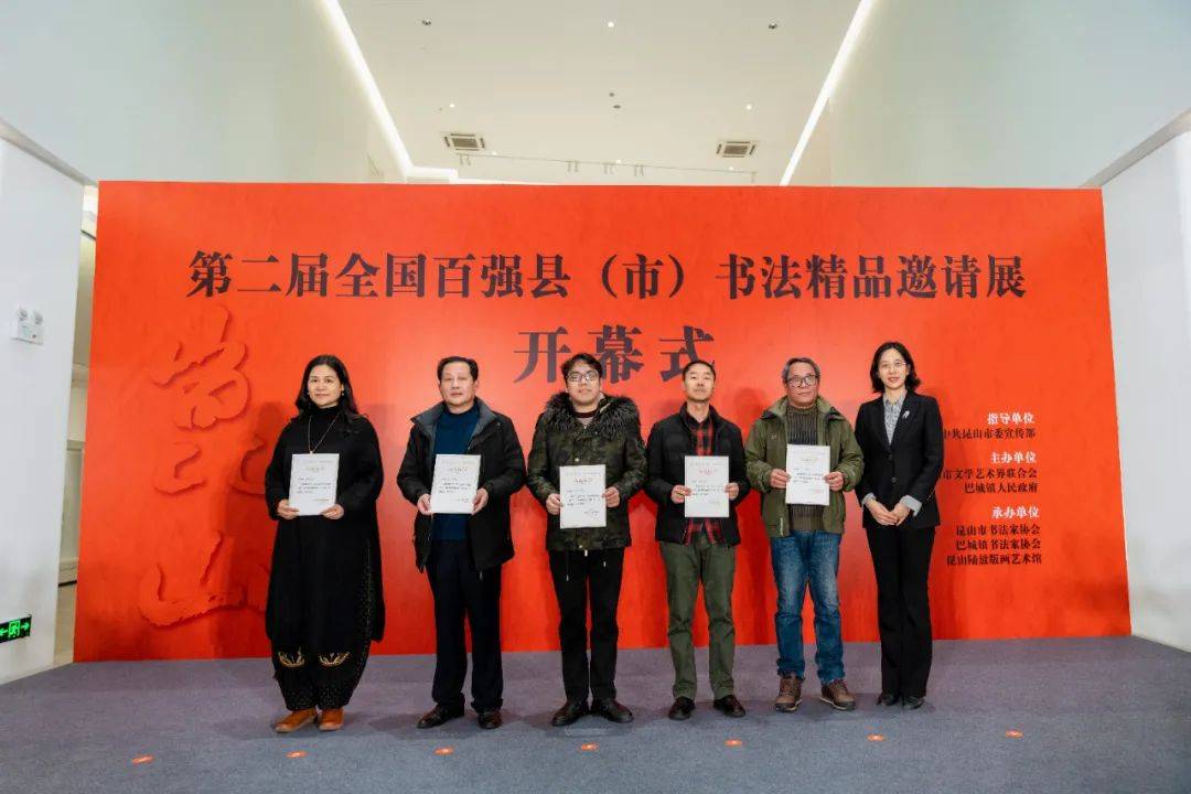第二届全国百强县(市)书法精品邀请展开幕 12月28日下午,由中共昆山市委宣传部指导,昆山市文学艺术界联合会、巴城镇人民政府联合主办,昆山市书法家协会、巴城镇书法家协会、昆山陆放版画艺术馆承办的“第二届全国百强县(市)书法精品邀请展”在昆山陆放版画艺术馆隆重开幕。 中国艺术研究院书法院研究员、中国文字博物馆研究员胡传海,中国书协书法评论与文化传播委员会委员、书法报社董事长、总编辑毛羽,《书法报·书画天地》编辑部主任金日发,苏州大学艺术学院艺术博士、硕士研究生导师、江苏省教育书法协会副会长、苏州市书法家协会副主席徐世平,中共昆山市委宣传部副部长巫继东,昆山市文联党组书记、主席冯惠清,巴城镇党委副书记李晟,昆山市文联副主席周晓佳,中国昆剧古琴专家指导委员会委员、国务院特殊津贴享受者、苏州市文联原副主席杨守松,昆山市书协名誉主席陆家衡,昆山市书协名誉主席俞建良,昆山市文联副主席王金春,以及本次展览参展作者代表,昆山市各区镇分管领导、文联主席,市文联各艺术家协会主席,昆山市书协会员代表出席了开幕式。