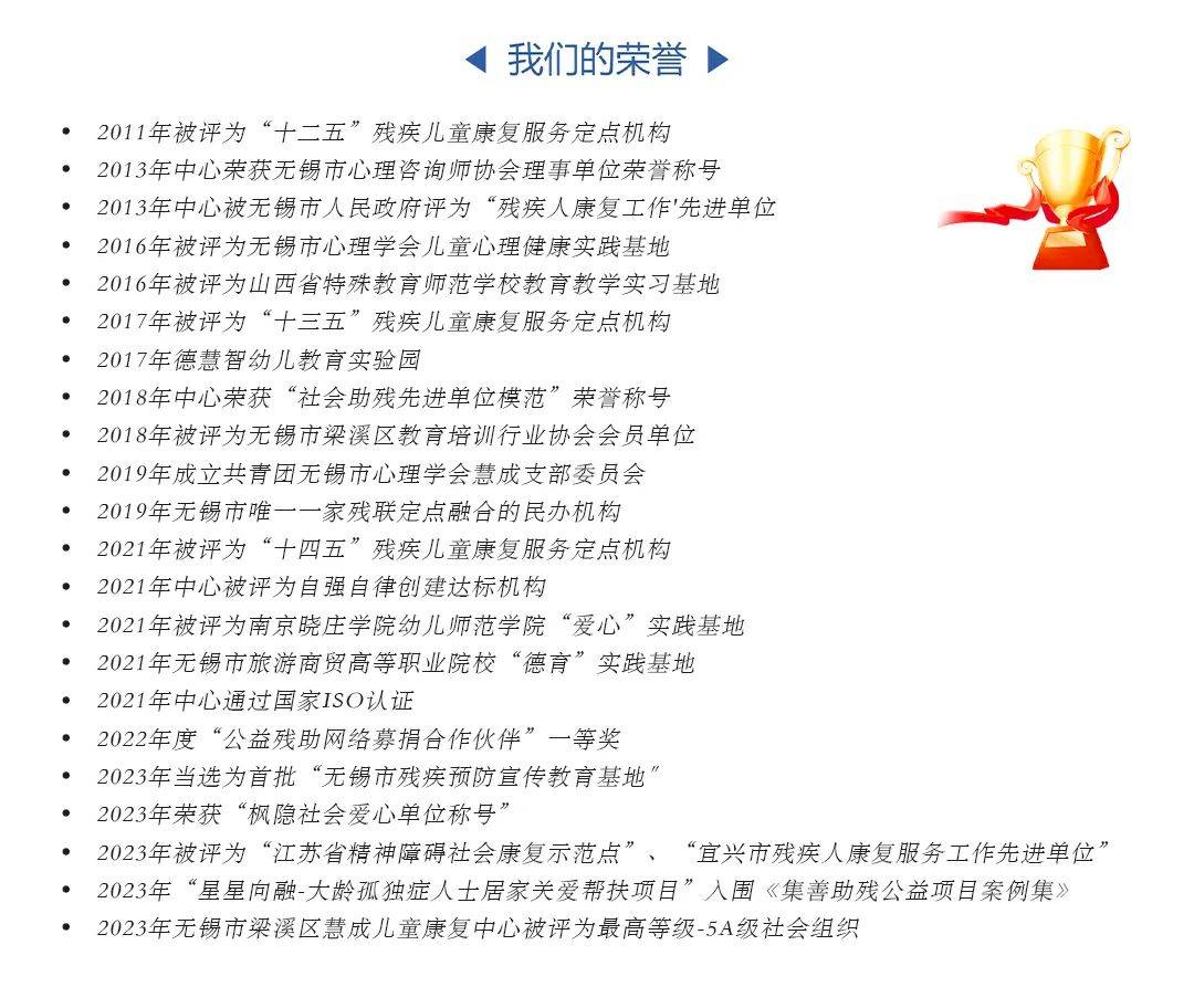 无锡市第一家从事儿童康复的民办非营利机构。主要从事孤独症,发育迟缓等心智障碍儿童干预及康复。中心成立了团支部、党支部、妇联组织,先后获得“十二五”政府定点康复机构,“十三五”政府定点康复机构,无锡唯一一家定点融合康复机构、无锡市心理学会儿童心理健康实践基地,共青团无锡市心理学会慧成支部委员会,德慧智幼儿教育实验园,2013年残疾人康复工作先进单位,无锡市“社会助残先进单位模范”,山西省特殊教育师范学校教育教学实习基地,多次发表教学课题和国家级论文并获奖等各项殊荣。2020年被评为4A级社会组织,现被评为5A级社会组织。