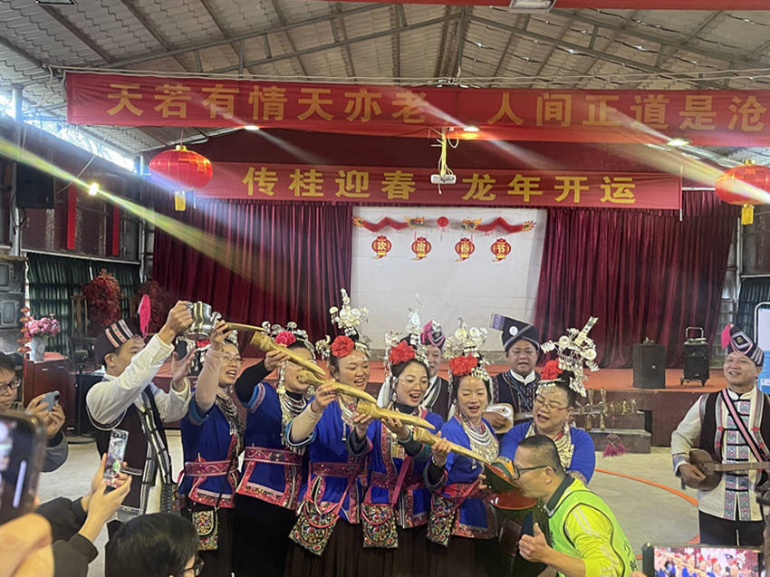 在接下来的长桌全猪簸箕宴上,身穿美丽侗乡服饰的姑娘们唱着敬酒歌分别向宾客们敬酒。侗族民族风情浓郁,人们热情好客,自古就有“无酒不成礼,无酒不成席”的规矩。《高山流水》米酒文化就是侗族文化里最著名的六宝之一。几个漂亮的姑娘一边歌唱一边为远方的客人倒酒、敬酒,歌声不停,酒水不断。动听的歌声,丰盛的菜肴,香醇的美酒,大家愉悦地品尝美食、畅叙友情、共话未来,共同祝愿彼此在新的一年里取得更加辉煌的成绩。