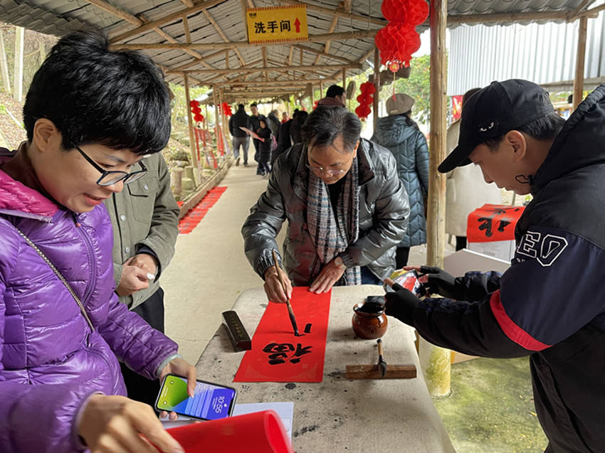 在文化长廊里,十几位书画老师正在现场挥洒笔墨,书写新春祝福 。大师们运笔如飞,笔力雄健、气韵生动,既有辞旧迎新的美好愿景春联,也有大展宏图的励志画作。在送“福”区域,书法家们个个挥毫泼墨,一幅幅象征着平安和谐、充满美好祝愿的春联和一张张笔酣墨饱的“福”字跃然纸上。除了名家送春联活动,其它的活动区域节目也同样精彩纷呈。在那里,可以聆听非遗侗族大歌,可以参与非遗扎染体验,可以亲自手制作非遗马打滚,还有非遗南宁年糕品鉴、开运香囊约体验、触球体验等等,每一个活动都是年味十足,既勾起了人们儿时美好的记忆,又能品味和了解到中华优秀传统文化的精髓。