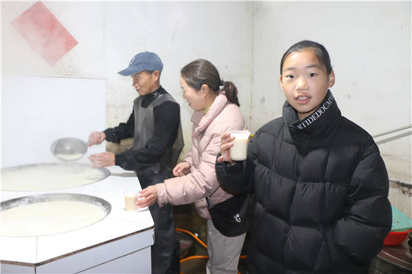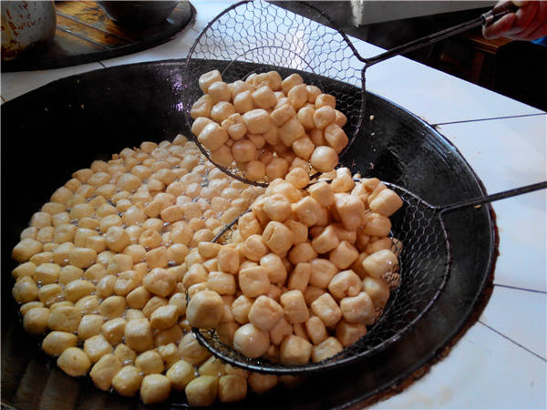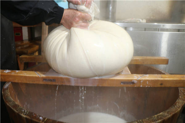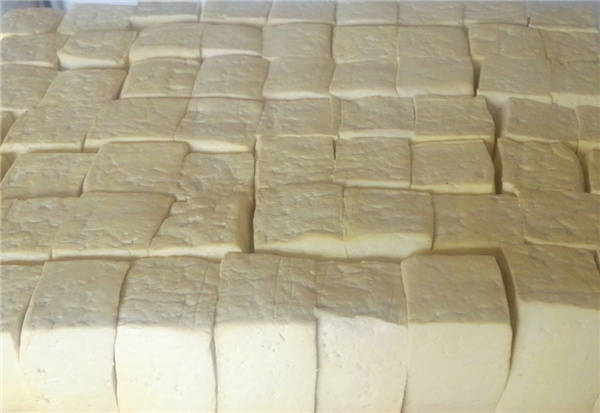 在豆腐坊里,只见张喜国先把豆浆水装进纱布做的“豆腐袋”里,放在一个木制的架上,木架下是一个“豆腐桶”。张喜国使劲揉着“豆腐袋”把浆水挤进桶里,纱布里留下的就是豆腐渣。张喜国说,千万不要小看了豆腐渣,若加点萝卜丝,或煮或炒,再加点葱等佐料亦是一道美食。 土灶里柴火烧得正旺,张喜国将挤出来的浆水在大锅里煮得沸腾,便是人们平常吃的豆浆。将豆浆从大锅舀回“豆腐桶”中,加入适量的盐卤,用大勺子按顺时针方向把豆浆搅均匀,等待片刻,豆浆就变成了白花花的豆腐花。将豆腐花上方的清水舀掉,将豆腐花舀入用纱布铺就的一个木制方形模具里,用纱布包好豆腐花,盖上木盖,再用重物来压,压力会把剩下的水份逼出,一个多小时后,搬开重物和木盖并将其反转过来,除去纱布,一灶乳白色的豆腐便新鲜出炉了。 在做这几道工序时,大人、小孩可以从喝豆浆开始,接着喝豆腐花、再吃生豆腐,随自己喜欢或甜或咸,或加点辣椒酱、茐花什么的,热气腾腾,美味十足,直吃得全身发热。