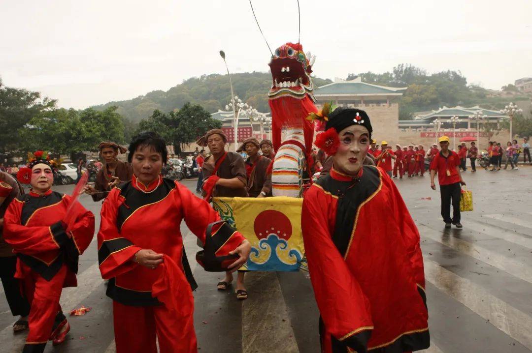 踩街方阵——扒龙船: 扒龙船的习俗由来已久,扒龙船的民俗文化是在深沪的海上划白龙船基础上改变的。清朝同治年间,深沪海上划龙舟比赛用白龙船,后来因在海上受潮汐影响比较大,海上划白龙船中断,改为旱地扒龙船民俗表演,并于每年端午节在深沪踩街。扒龙船,由龙头、龙身和龙尾组成,龙头还能喷水和喷火,表演者身着深沪传统渔民服装,不仅贴合深沪实际,而且观赏性较强,表演的动作则是模仿海上扒龙船,是一项具有深沪特色的传统民俗活动。