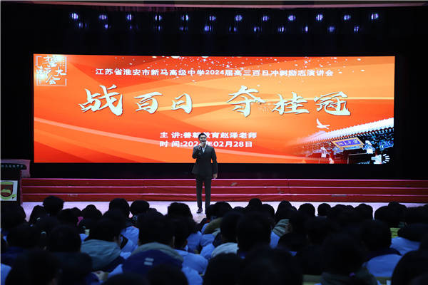 淮安市新马高中为激发高三学子奋进冲刺斗志,于2月28日,特别邀请了善朝教育集团金牌讲师、青年励志演说家赵泽老师来校作了一场励志演讲。