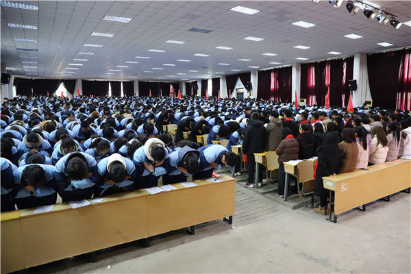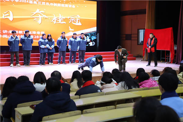 二、动容。在同学们静思过后,赵老师进入互动环节。他鼓励同学们勇敢地走上舞台,用最大的声音喊出自己的目标大学;随即又提出新挑战:高考成绩要提升多少分,就要做多少个俯卧撑。一位同学毫不犹豫地俯下身去,一口气做了几十个,动作逐渐变慢,但他从未停下。台下越来越多的同学跑上台一起做起俯卧撑,用行动表达支持和决战高考的勇气,全场师生为之动容,为他们助威呐喊。 三、动情。赵泽老师用富有激情的语言,从理想、舍得、感恩、坚持等几个层面,以一次次发问、一个个感人的故事,唤醒了学生深藏在心中的那份感恩之情。在他的带领下,全体学生起立以感恩的心拥抱老师,表达感恩之情;拥抱同学,表达并驾齐驱互相帮助互相鼓励之情。一幕幕温馨而感人的场景令人终生难忘,也使现场气氛达到了高潮。
