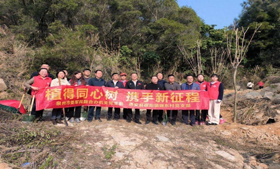 最是一年春好处,植树添绿正当时。在第46个全民植树节到来之际,为加快推进美丽泉州建设,创建模范机关,营造全民义务植树良好氛围,以实际行动践行“绿水青山就是金山银山”的发展理念,3月8日下午,泉州市委军民融合办机关党支部联合惠安县螺阳镇党委、螺阳镇锦东村党支部、惠安县锦水中学、螺阳镇锦水小学等单位开展“植得同心树 携手新征程”主题党日植树活动暨“三八”国际劳动妇女节文明实践活动。