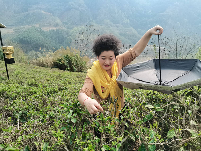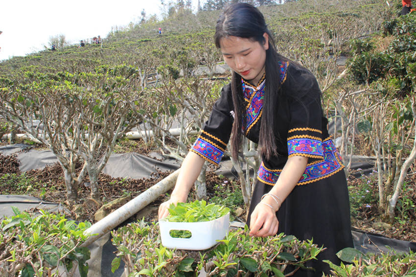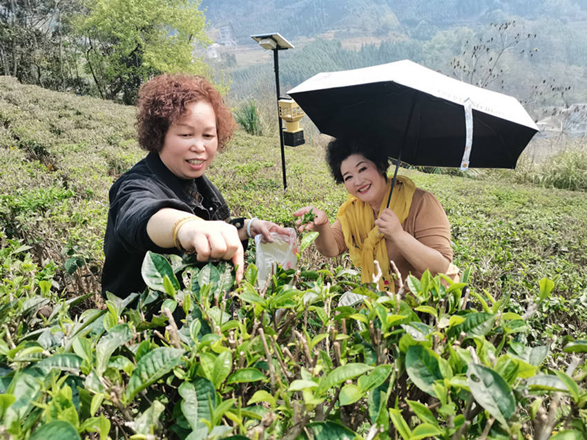 国家一级演员,百色市歌舞团著名歌唱家黄依兰亲自体验采摘茶叶。