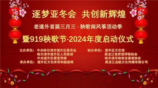 值2025年第九届亚冬会开幕式倒计时300天之际,由哈尔滨市道外区委、道外区政府主办,道外区文化体育与旅游局承办,道外区文化馆、黑龙江省资信评级协会、哈尔滨市助老志愿者协会协办的“逐梦亚冬会·共创新辉煌”喜迎亚冬会开幕式倒计时300天 暨“919秧歌节2024年度启动仪式”,于2024年4月11、12日上午在哈尔滨市道外区巴洛克大舞台广场举行。