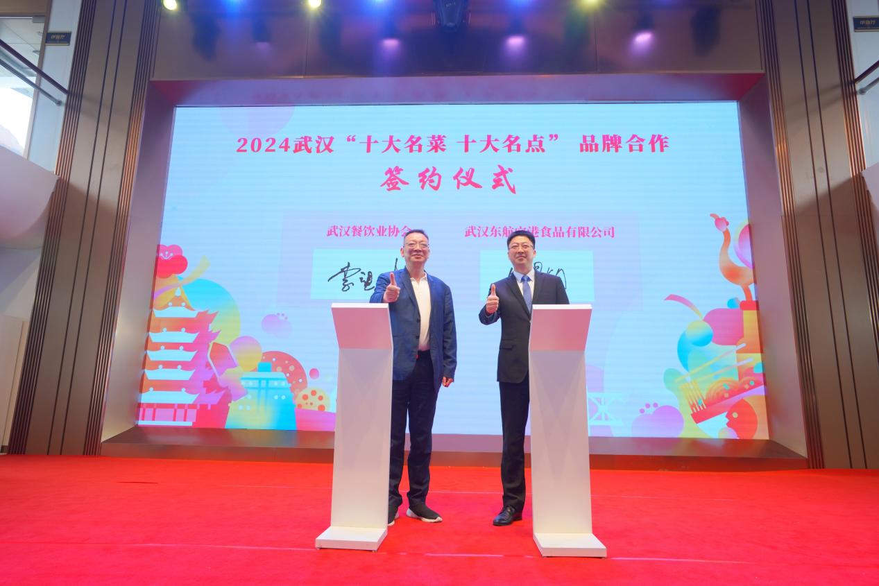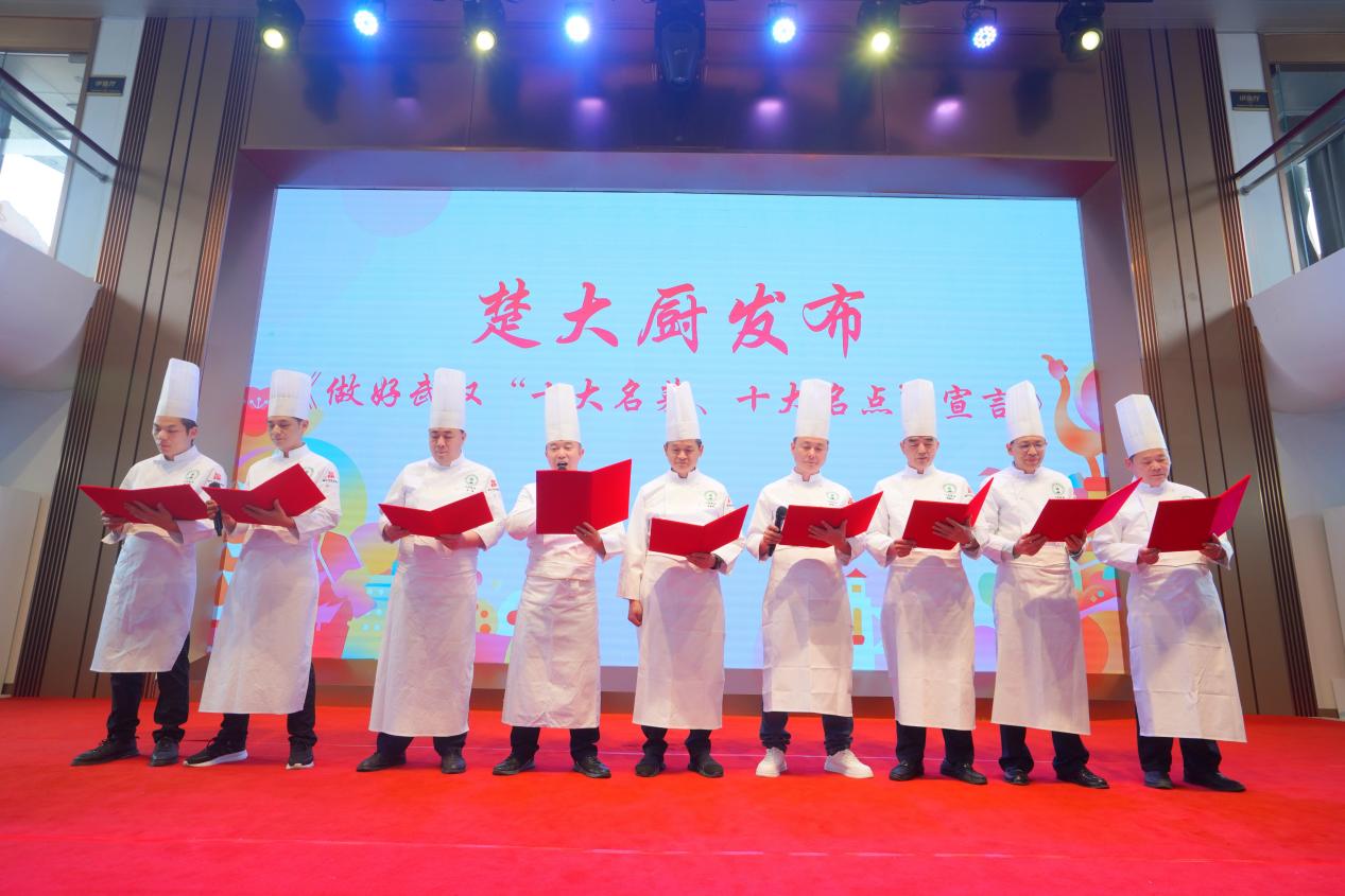 在发布会现场,他们身着统一服装、庄严宣誓,共同发布了《做好武汉“十大名菜、十大名点》宣言:要用好“十大名菜、十大名点”公共品类,打造“名菜、名点”招牌菜,持续擦亮武汉“中国十大旅游美食城市”名片。与此同时,武汉餐饮业协会也与武汉东航空港食品有限公司达成了合作,双方将整合名厨及供应链资源,推荐适合东航武汉公司需求的航空餐食,打造“空中的名菜名点”。