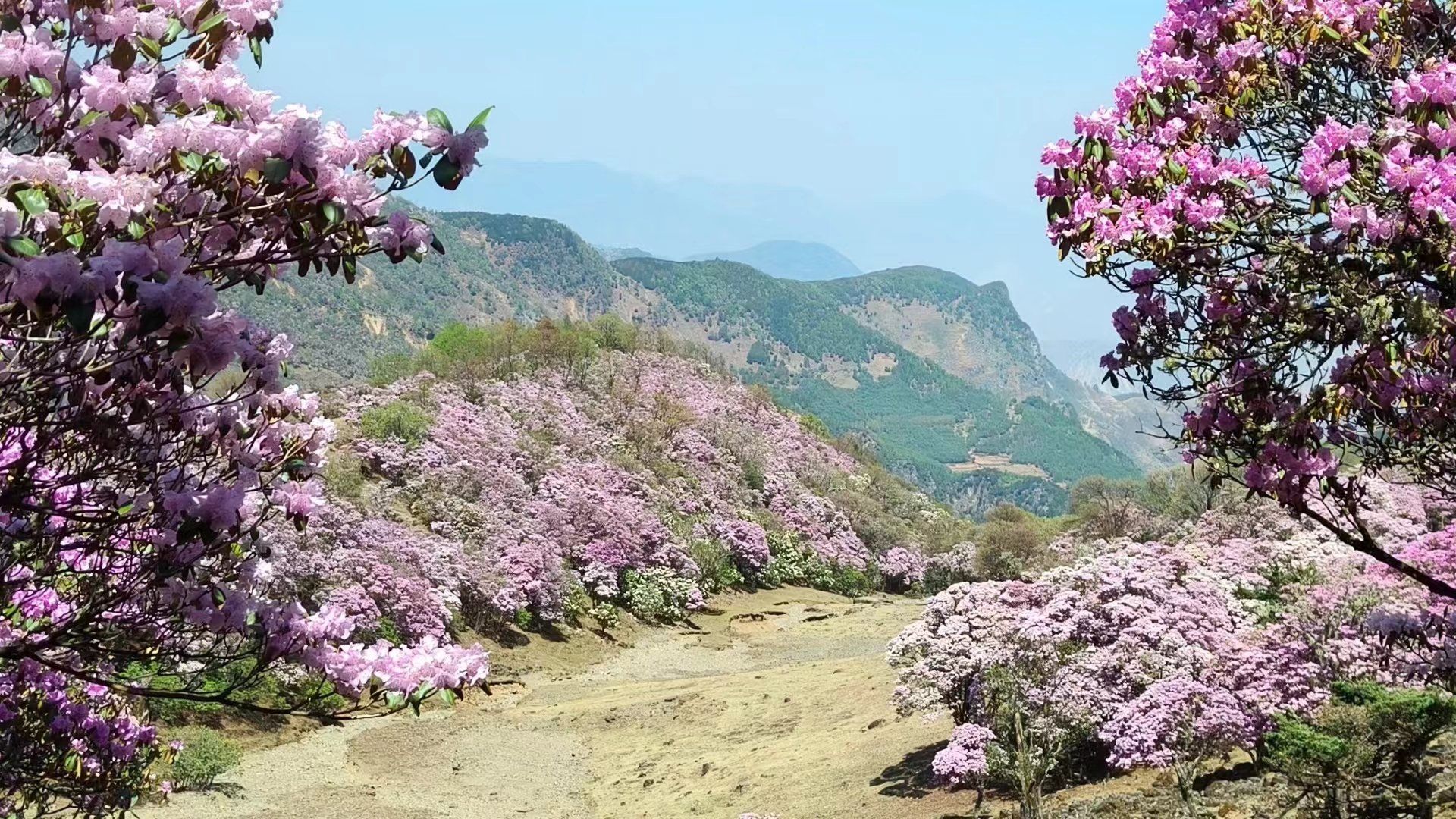 目前,昆明市禄劝县轿子山的杜鹃花,已经从海拔 3000 米的四方景开到了海拔 3800 米的大黑箐。漫山遍野的杜鹃花,七彩斑斓、争奇斗艳。它们在风中摇曳,在云影下跳跃,以热情奔放的姿态迎接每一位前来打卡的游客。走进花海山谷,你一定会被一树树的鲜花吸引,流连忘返。