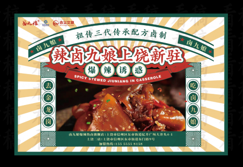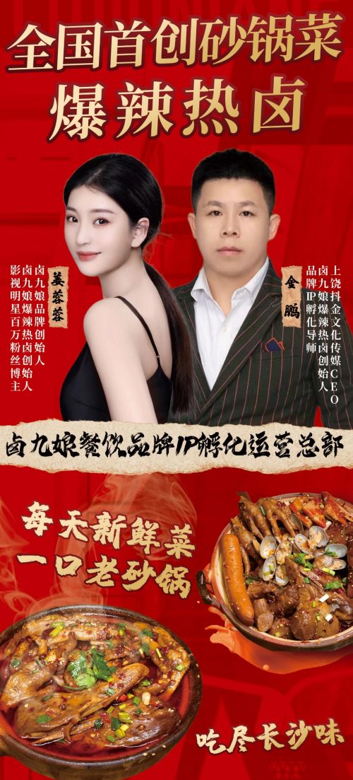 卤九娘爆辣热卤宣传海报 卤九娘品牌创始人姜蓉蓉介绍:“卤九娘,是一家集地方土特产、餐饮品牌连锁为核心的一家食品生产、管理、品牌连锁的运营公司。从名字上可以看出以卤味食品为主,娘,家的感觉,母亲的味道,很有亲切感。卤九娘品牌目前有南京特产盐水鸭、沉香鸭、鸭血粉丝汤、湖南熏肉、江西腊肠、安徽符离烧鸡等产品,以线上明星、百万千万粉丝体量的网红直播带货、崇恩电商直播基地签约的素人主播带货为主,最高在线粉丝180万;人民日报人民文旅推荐品牌;线下入住五星级酒店、高铁、机场、旅游景点、土特产专卖店、直营店等上百家合作点,品牌曝光度过亿!”