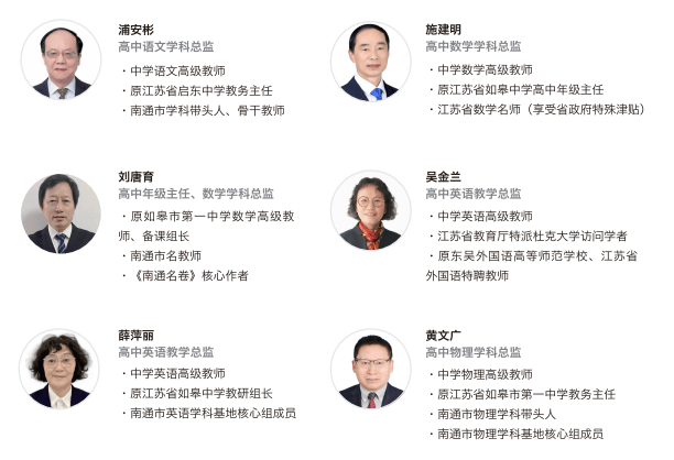 南通市德育标兵、骨干教师 【枫华普高师资团队(部分)】 教研团队:枫华同样遵循 “精品、一流” 的办学方针,学科总监均从 “中国高考强市” 南通市名校——如皋中学、启东中学等名牌高中选聘,特邀在培养清华、北大优生方面有成功经验的学科带头人、⻣干教师,领衔枫华普高教师团队,确保枫华普高教育高起点、高标准、高追求,培优拔尖,助力学子 顺利考上国内 “双一流” 大学!