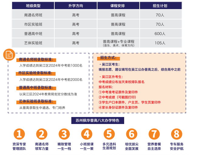 结盟南京大学,依托师资优势 创办南通名师班,合力培养拔尖人才 利用本校南通名师资源,在2024级新高一组建清一色南通名师授课的“南通名师拔尖创新班”,并且与江苏省如皋中学、白蒲中学、江安高级中学等南通名校深度合作,实施高质、高端、高效教学。枫华此举,旨在全面育人、素质育人、拔尖育人“三箭齐发”,向国家“双一流”大学输送更多、更好、更尖的人才 。 南通名师班火热招生