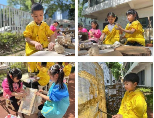 3.户外场地:“享泥趣,悦成长”、“沙漠绿‘舟’”、“绘染童心 ‘艺’童成长”、“奇趣野战” 结合幼儿园课题研究,同时,基于幼儿经验生长对园本自然资源进行探索,沙水池、玩泥区、野战区、“益”米菜园等都是孩子们户外游戏丰富的资源,孩子们自由合作、自主选择材料,共同快乐游戏,丰富多样的户外游戏活动中,能惊喜地发现孩子们主动学习、敢于探索、乐于创造、大胆自信的良好品质。