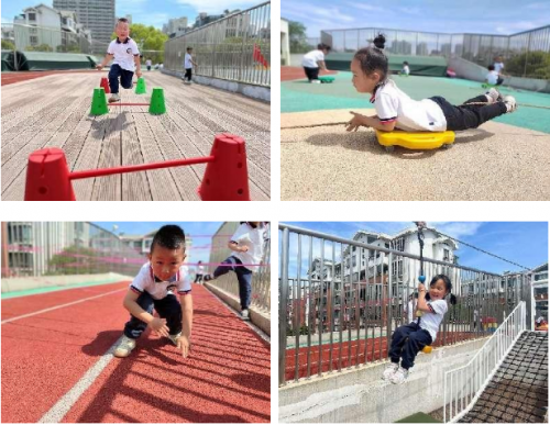 一、观·潮娃游戏现场 户外,充满自然、野趣、挑战、创意,处处都有潮娃们玩耍的快乐空间,处处流淌着幼儿生活、学习、游戏的痕迹,为更好地支持幼儿在户外游戏中获得更多发展的可能性。老师们创设多样和可玩的场地,不断探究识别孩子的游戏行为,耐心观察倾听,助推孩子的成长。 1.楼顶:“乐”运动 “悦”成长 小班老师根据幼儿体能全面发展的需要,利用幼儿园楼顶特有的循环区域,以及各运动器械的合理组合,创设了“‘乐’运动,‘悦’成长”体能大循环运动游戏。多样化的运动游戏,孩子们玩得不亦乐乎,体能得到全面锻炼的同时,更培养了幼儿的良好个性和意志品质,达到身心健康发展的目的。