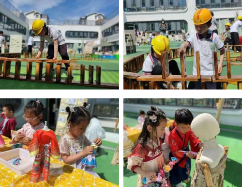 2.操场:“穿越时空,拾忆古韵” “穿越时空,拾忆古韵”主题活动中有“水墨一方”、“一抹茶香”、“一丝雅韵”、“在水一方”等游戏活动,这里是一次穿越时空的盛会,老师和孩子们同体验、共成长,在难忘的穿越游戏中,感受中国传统文化的魅力,增强了对中华文化的了解。