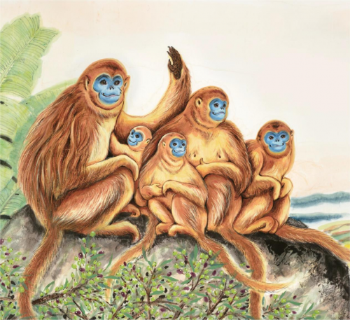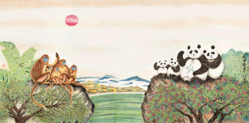 《盛世双宝》局部 著名动物画家刘中历时半年创作完成的中国画《盛世双宝》可谓是近年来表现武都“双宝”的艺术巨制,视觉张力十足。画中大熊猫们的慵懒憨萌与金丝猴群的活泼机敏形成了饶有趣味的对比;背景处多彩的梯田和云雾缭绕的远山是武都区裕河镇的经典元素。漫至峰顶的雾气散成一片片轻柔的薄纱,空灵缥缈。画家刘中那笔下娴熟灵动、中西浑融的彩墨丹青,在“外师造化”之时,却又“中得心源”,在精细雕琢大熊猫与金丝猴之余,也将其注入了灵性与生命,赋予人类的思想与情感,从而关照观者各自的内心,寄情于山水墨色之间,令“双宝”徜徉在武都那饱含中国传统山水图式的审美趣味之中。
