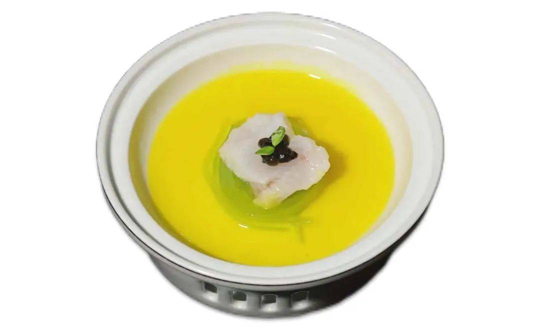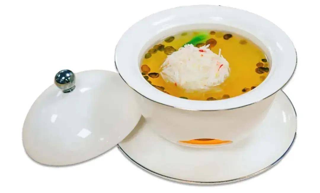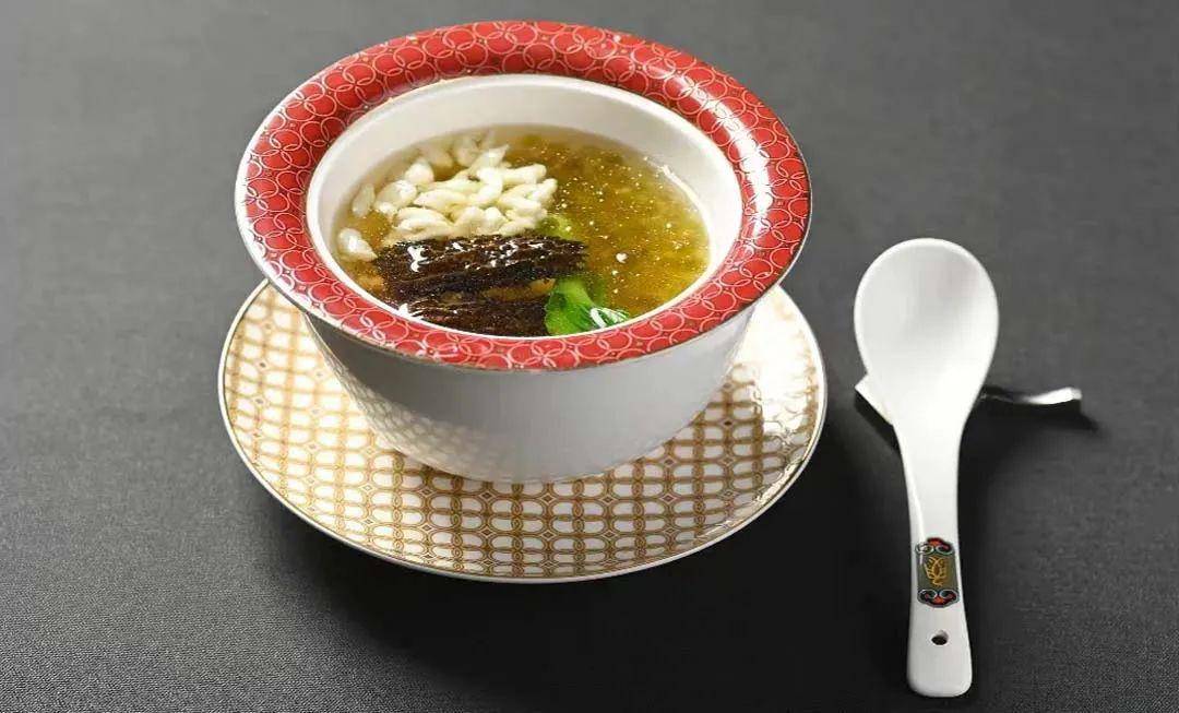 ▲食材选用樊口武昌鱼、恩施葛仙米、极品官燕、蟹肉、老鸽汤,此菜借用湖北宜昌秭归昭君出塞的历史典故研发和创新,体现了传承和创新的结合。 葛仙米清汤鱼米