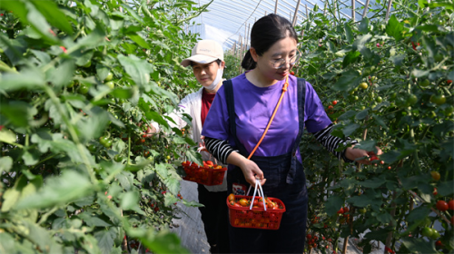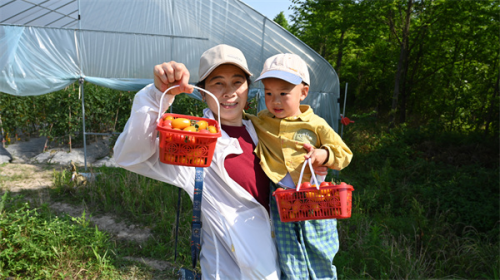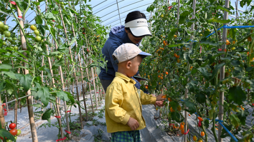 在如此美好的季节里,踏入位于浙江省武义县南湖村的万兴农业开发有限公司果蔬基地,眼前景象令人陶醉。一串串晶莹剔透的小番茄,宛如玛瑙般充满丰盈和可爱。绿色的藤蔓缠绕着竹架向上攀爬,底部和中间的果实,红得发亮或黄得诱人,已经成熟可供采摘;而顶部的嫩果则呈现出清新的青色,开着黄色的小花朵。一根藤上展示了果实三个不同的成长阶段,形成了一幅热闹非凡的画面。水果玉米和糯玉米也相继上市,甜瓜、丝瓜等各种果蔬也陆续成熟。借助日光温室大棚的优势,这里的果蔬四季飘香,让土地得到充分利用,实现了收益的持续性。无论何时,都能品尝到新鲜的水果和蔬菜,这是一种无与伦比的美妙体验。被大家亲切地称为“东叔”的曹卫东仿佛就是那故事里的蜜蜂,用勤劳书写着新版农民的故事。