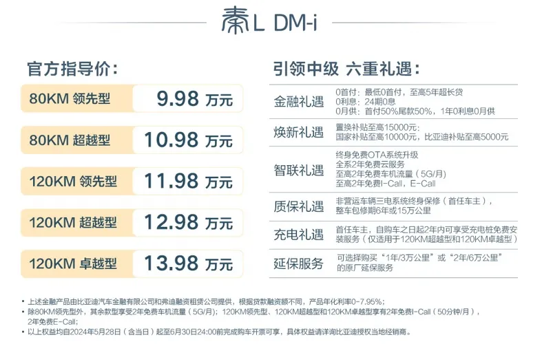 2024年5月28日,比亚迪王朝重磅新车秦L DM-i在西安震撼上市,首搭第五代DM技术,百公里亏电油耗达到划时代的2.9L,“一箱油”满油满电综合续航达2100公里,开创油耗2时代!堪称“工业奇迹”!新车推出纯电续航里程80KM和120KM两个版本,共五款车型,售价9.98万-13.98万元,从设计、技术、平台、品智四大维度,全面引领中级轿车新趋势。