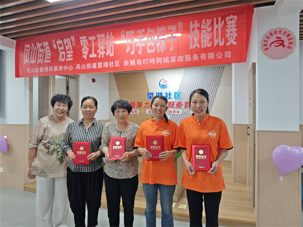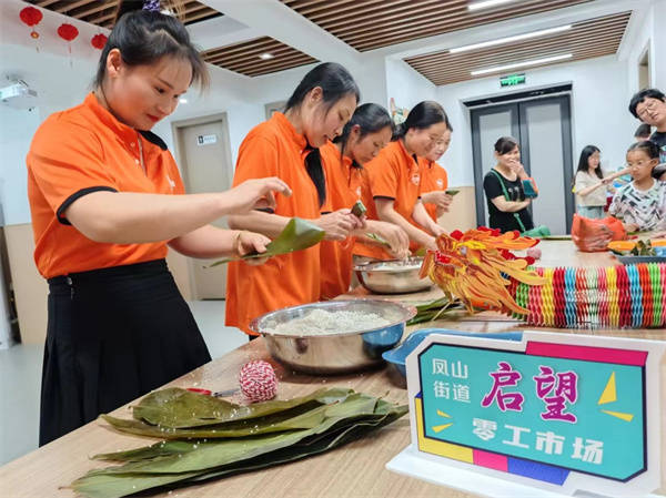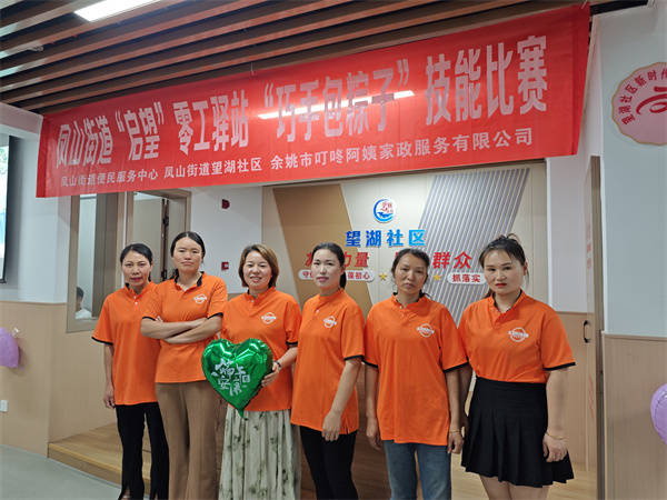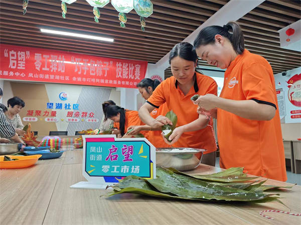 端午近,粽香飘。5月30日晚上,浙江余姚凤山街道便民服务中心“启望”零工驿站联合望湖社区、余姚市叮咚阿姨家政服务有限公司举办“巧手包粽子”技能比赛。选手们纷纷撸起袖子,拿出自己的“绝活”。折粽叶、装米到包裹缠线一气呵成。望湖社区为零工提供专门服务的公益场所,致力于为群众提供多元化的学习和就业机会,帮助他们掌握一技之长,提高就业能力和上升空间。