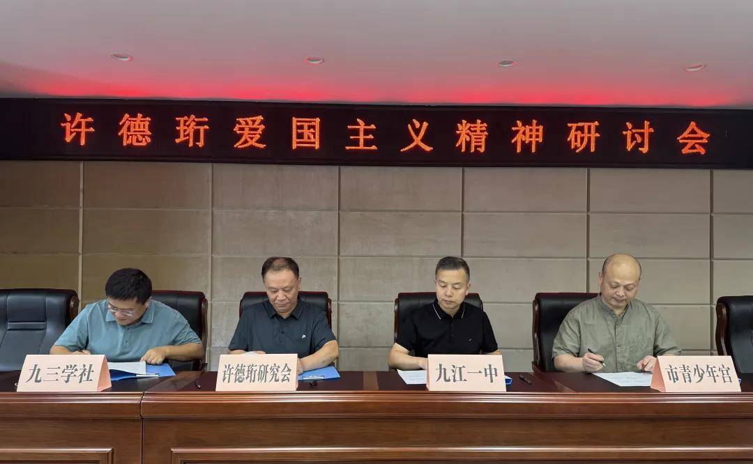 在与会领导、嘉宾和代表的见证下,九江市广播电视台原党委书记、九江市文广新旅局原一级调研员、九江市濂溪区许德珩研究会会长钱双成,九江一中校长李青,九三学社濂溪区支社主委吴官峰和九江市青少年宫主任霍彪,代表四方合作单位共同签署了“许德珩研究会青少年委员会”共建协议,并一致表示要扛起政治责任,狠抓工作落实,齐心协力把“许德珩研究会青少年委员会”建设好,把作用发挥好。