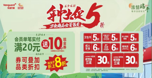 据悉,华润万家此次端午让利活动时间为6月5日-6月18日,万余商品会员低至五折,给众多消费者带来超多折扣福利。覆盖品类之多可谓是“满汉全席”,卫生巾、拖鞋、水具、酒具、床上用品等五折,调味品、包装面条面粉、国产洗衣粉洗衣液等6折,休闲零食、酸奶饮料、文体玩具、服装床品、清洁护理、厨房小件……超多品类商品都有“5折、6折”等不同程度的折扣。卫生巾、拖鞋可充分满足周边消费者一日三餐和居家生活消费需求。前段时间到店消费满20元的顾客可叠加华润万家送的10元现金券使用,相当于折上8折更划算。 浓情端午 好礼不断 基于门店商圈调研及消费者研究,华润万家持续对门店进行调整升级,关闭一些到期的陈旧店铺,并持续对现有门店进行升级,在整体商品结构上下功夫。通过大单品、定制品、新品、高性价比商品赋能“商品力”,涵盖食品、调味品、酒水饮料、日配、个护清洁等民生品类,整体向“性价比高”“品质化”的方向进行调改。为家庭群体消费者的美好生活提供更多物超所值的选择。