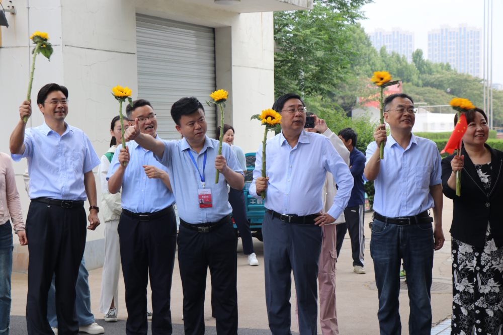 陈进董事长、于敏校长和家长们,一起高举向日葵,竖起大拇指,为考生加油鼓劲。