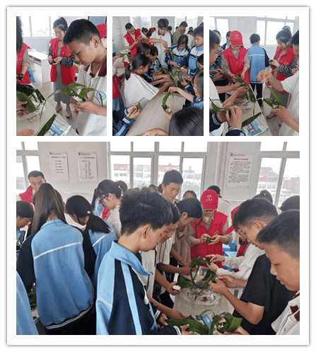活动现场,同学们一起围在桌子旁,认真跟老师学习包粽子的方法。卷粽叶、填糯米、放蜜枣、包粽子、系彩绳,孩子们分工协作、配合默契,经过一番操作后,一个个粽子整齐的放置在托盘里。虽然包出来的粽子各式各样、大小不一,但每个人都沉浸在亲自动手的快乐之中,使整个场所充满了和谐、温馨、愉快的气氛。