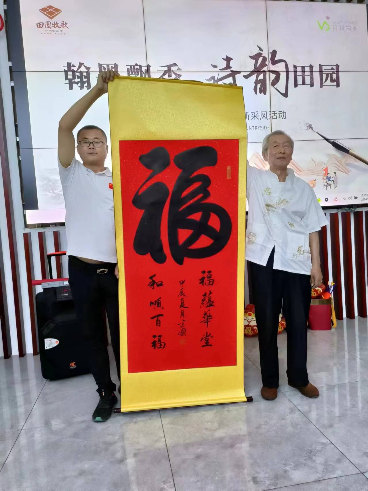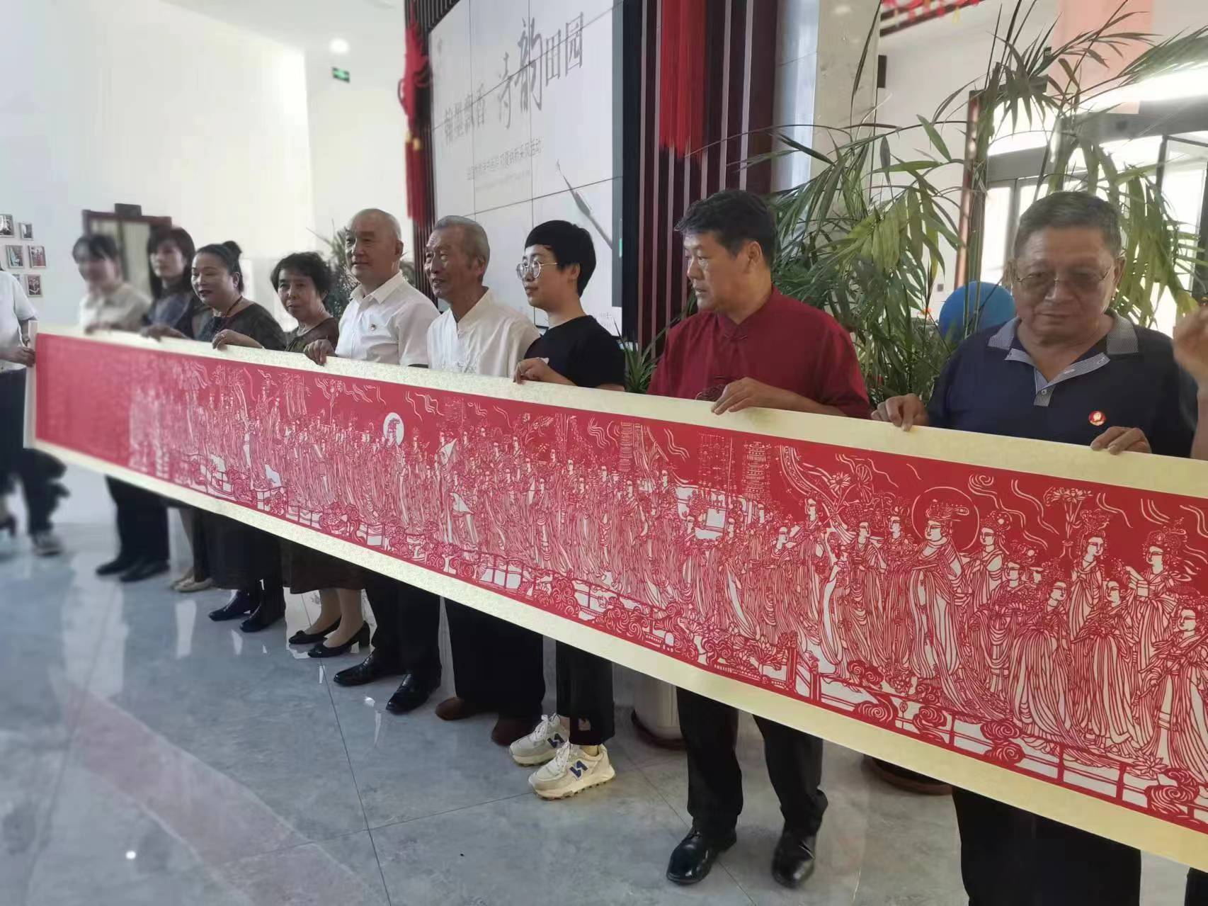 田园牧歌康养社区营销经理李安,诗书画院院长王世平主持了活动。书画家们体验了康养社区独特的美景和艺术氛围,汲取创作灵感。现场创作,展现艺术才华,享受田园风光与文化艺术的完美融合。 来自安徽的书法家刁峰老师一副5252字的长卷,大乘金刚般若波罗蜜经《金刚经》写得万毫齐力,恭敬端正,工整端庄,生动形象融入了佛家的思想的内涵。 安徽著名“剪纸”艺术家张瑜老师展示了历经三年完成的的剪纸长卷《清明上河图》。刻得质朴清新,惟妙惟肖,独具匠心 ,粗犷处大刀阔斧,细微处行云流水。 唐山的书画名家孟天增的长卷《百子图》,画得栩栩如生、活灵活现,墨韵盎然,成为本次活动的靓丽风景,引发轰动。唐国亮的毛体书法,王桂东的国画《事事如意》韩来福的《葡萄》苑秀芬的《富贵牡丹》笔墨精到。丰富多彩,岳贵金,吕建华,王泽平,刘泽利,陈建国等老师的书法钢钩铁骨,行云流水,搏得大家喝彩。