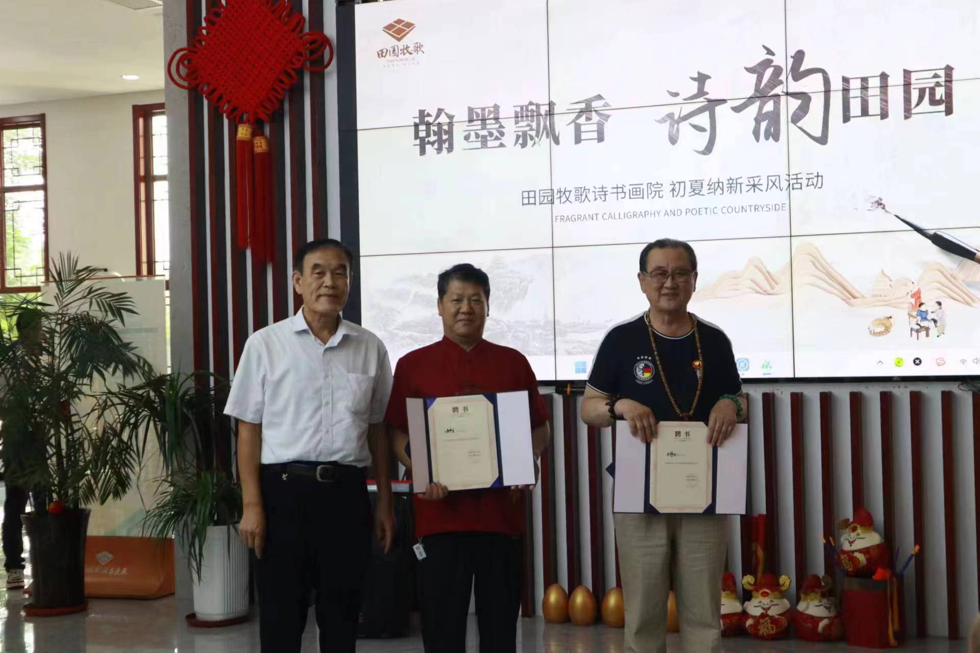 他们铺开洁白的宣纸,提起饱蘸墨汁的毛笔,如同指挥着一场无声的交响乐。每一笔、每一划,都是心灵的倾诉,是对端午这一古老节日的敬意。墨香与粽香交织在一起,营造出一种独特的氛围,仿佛时间都在此刻静止。 他们的笔下,山水有情,花鸟含韵。那一笔一划中蕴含的不仅是艺术的魅力,更是对生活的热爱,对传统的传承。田园的宁静与书画家们的专注相互映衬,让人心生感动。 为了壮大田园牧歌诗书画院的力量。笔会上还聘任了知名书法家王静秋,岳贵金为田园牧歌书画院副院长:聘任知名书画家穆树立,赵志云,王桂东,幺安全,陈建国,王世杰为田园牧歌诗书画院顾问,为田园牧歌诗书画院发展打下了坚实基础。