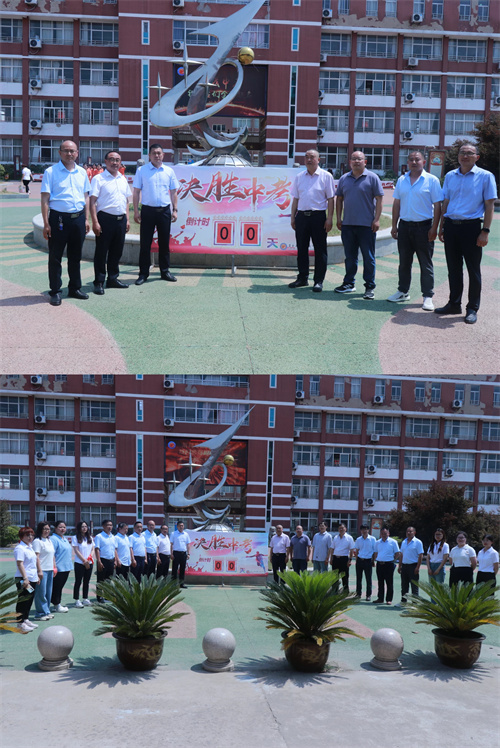 校领导给九年级管理人员和全体班主任送上深情寄语,并在倒计时牌前与他们合影留念。