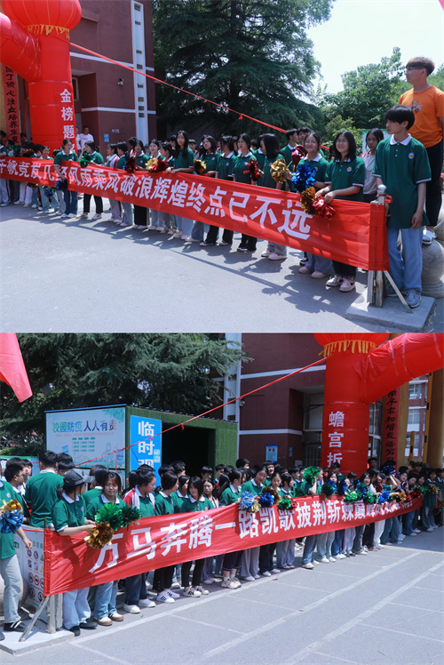 “万马奔腾、一路凯歌”、“乘风破浪、辉煌终点已不远”。站在得胜门两侧八年级的学弟学妹们,手持彩花,拉起鼓舞人心的横幅,做好了欢送学哥学姐们奔赴考场的准备,雀跃之情,溢于言表。