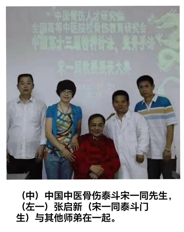 2012 年,张启新有幸拜【北京中医药大学教授、博士生导师、主任医师宋一同先生为师】;宋一同教授、主任医师。毕业于安徽合肥医专。北京针灸骨伤学院、主任医师、教研室主任。中国人才研究会骨伤人才学会理事长,中国高等中医院校骨伤研究会理事长。