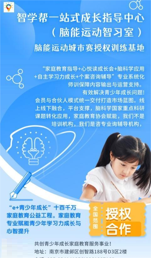 孩子是家庭的希望与明天,是爱与梦想的继承者。快乐素质教育可以有效减缓降低家长对孩子教育的焦虑,究竟何种形式才适得其法?许多家长在孩子的成长过程中,不知如何规划、如何培养学习力、如何提升记忆力、如何科学沟通,更不知如何有效指导。如何才能激发每一个独特个体身上所有的优秀潜质,做到因材施教?在这样的背景下,智学帮应运而生,以家庭教育专业指导,通过脑科学脑能运动心脑速算训练,培养学习力成长方法与潜能并提升心智,为数万家庭迎刃解万难,一站式实现自主学习能力养成。 脑能运动训练与AI自主学习力成长指导,实现方法、工具、服务的结合,把握时机让孩子的记忆力、专注力、观察力、思维力、想象力、理解力、创新力、行为力、感悟力等各项潜能,通过正确的训练方法开发引导,对孩子未来学习、工作、生活影响深远。 智学帮由南京文翔专修学校历经十多年教研,23年教育培训行业经验积累,超过10000 小时的个案时长,丰富的教学指导技术和咨询辅导实战经验, 形成一套易于复制的一站式成长指导培养模式。 旨在为5岁至18岁的青少年及其家长,通过素质教育、脑科学应用、心理辅导和家庭教育等多方面服务,全方位提升孩子的综合素养,为其未来的成功奠定坚实的基础。