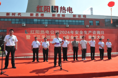 红阳热电公司总经理孙燕军(前排右)在“安全生产咨询日”暨“三无班组”“安全之星”表彰大会上讲话 6月16日,晴空万里,彩球飘飘。“人人讲安全 个个会应急—畅通生命通道”“深入开展安全生产月活动 守护生命和财产安全”等大型标语在红阳热电行政办公楼前广场十分醒目。辽宁沈煤红阳热电有限公司隆重召开“安全生产咨询日”暨“三无班组”“安全之星”表彰大会。首先,红阳热电公司总经理孙燕军讲话。之后,大会对2024年第二季度“三无班组”“安全之星”进行表彰颁奖。红阳热电近200名干部员工参加了活动。会后,还组织了“咨询日趣味安全竞赛”,比赛紧张激烈、选手团结协作,赢得了现场观众的阵阵掌声和喝彩声。