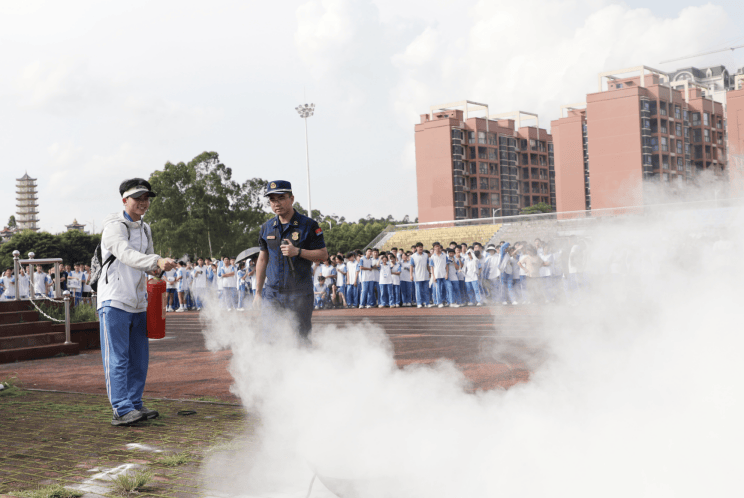 演练假设学校一教学楼内突发火灾,2000余名学生们在老师及消防员的引导下,低头弯腰,捂住口鼻,按照预定路线有序地撤离教室,并成功抵达指定撤离点。期间,消防员向师生们普及了如何报火警、火灾预防措施、火场自救及逃生方法等消防安全基本常识,并现场演示了灭火器的操作程序,邀请师生们参与灭火操作,掌握灭火器的正确使用方法。
