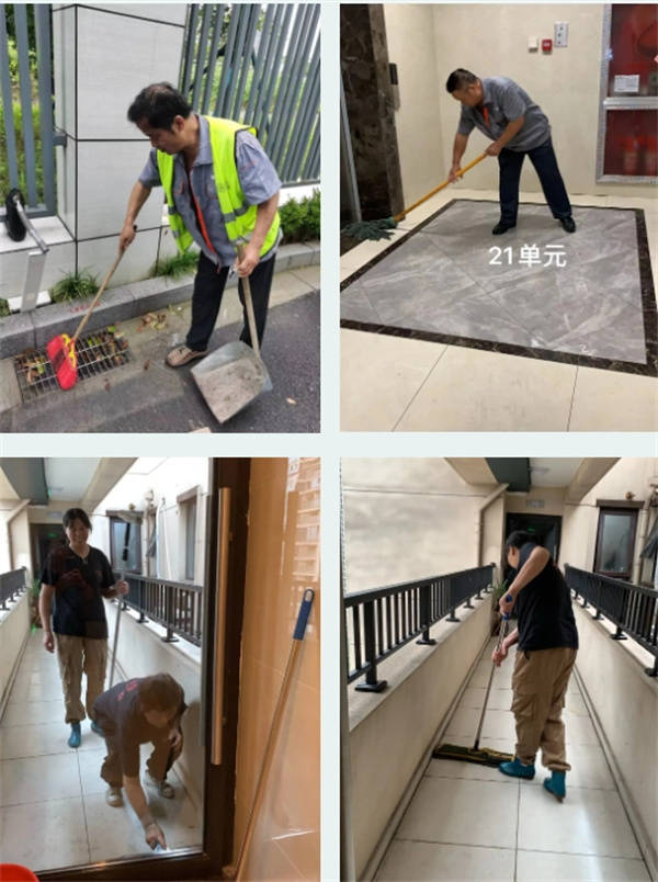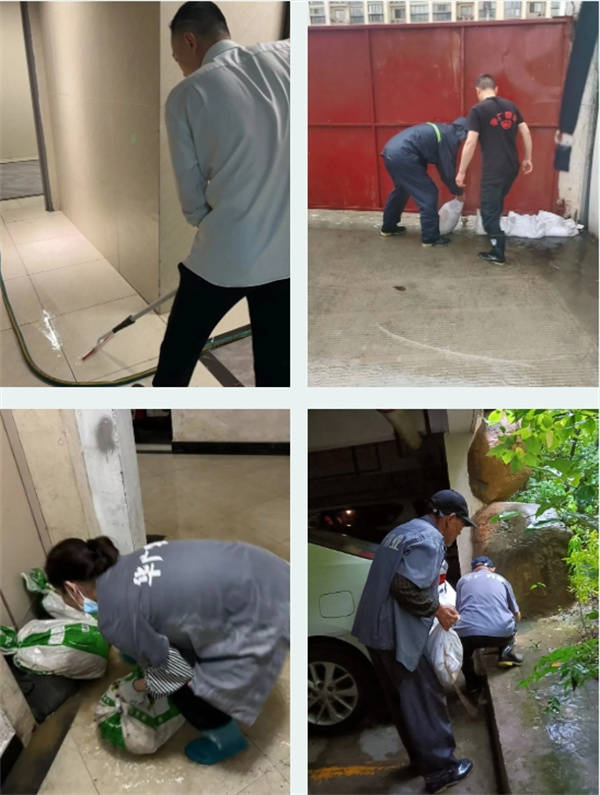 面对路面和非机动车坡道积水问题,华广物业的工作人员们也是迅速行动。他们不仅及时清理积水,保证交通畅通无阻,还在各单元门口和电梯门处放置沙袋、扫水,防止雨水倒灌,保障了居民的出行安全。