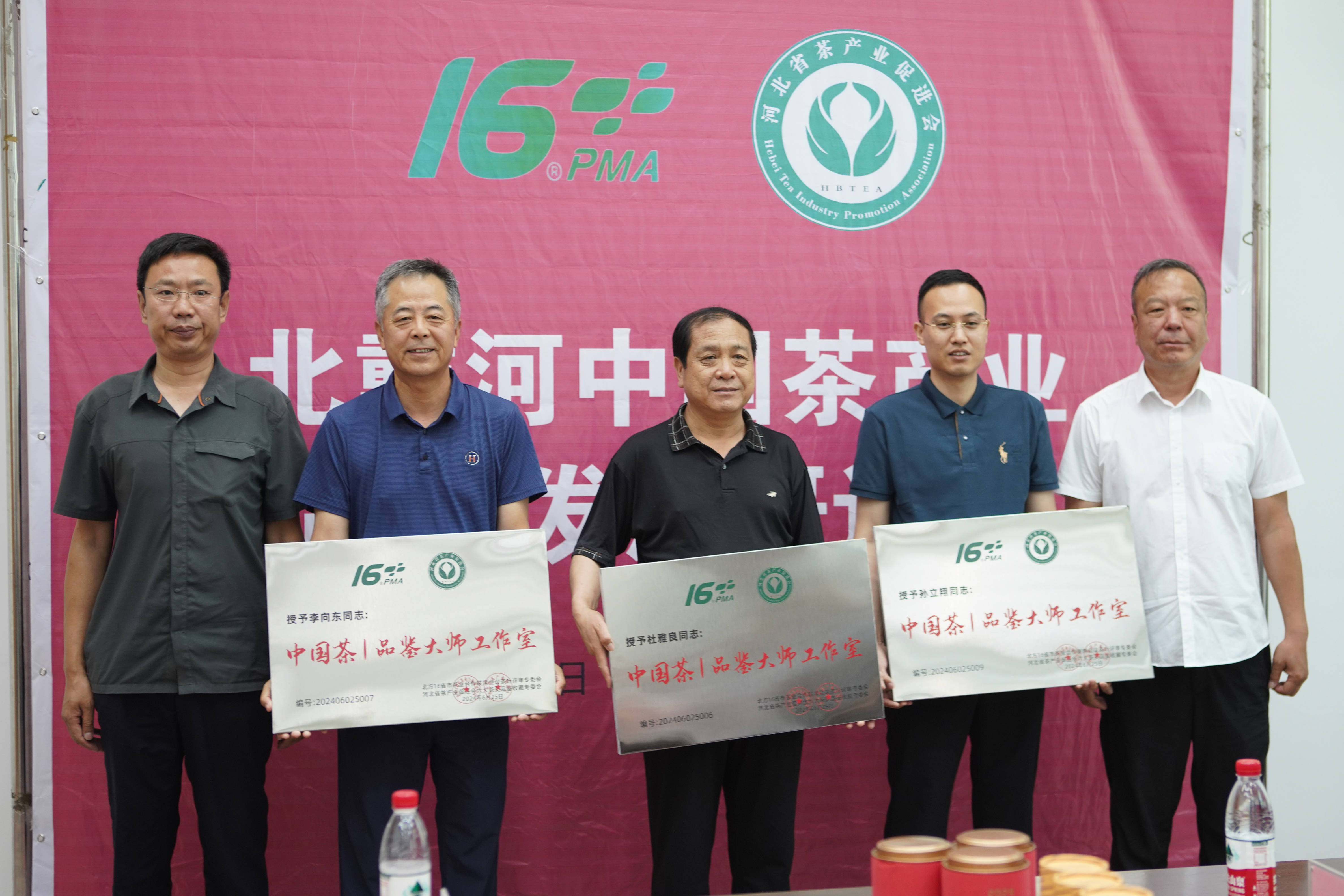6月25日,在北戴河中国茶发展战略研讨会议上,由沧州市茶文化促进会申报的李向东、杜雅良、潘冬生、孙立翔四位同志被北方16省茶业联席会、河北省茶产业促进会授予“中国茶品鉴大师工作室”。16省市茶业联席会执行主席、中国茶叶流通协会名誉会长、河北省茶产业促进会会长石若刚,河北省茶产业促进会副会长董刚为四位同志颁发了证书和牌匾。