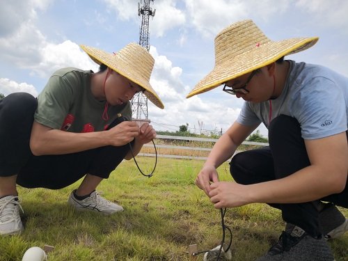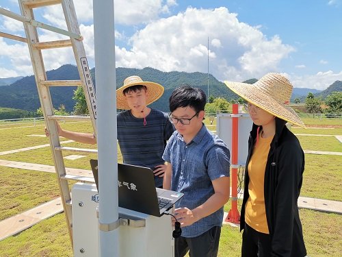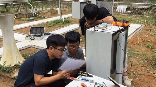 图为:林奕平(中间)在观测站校准气象仪器设备数据