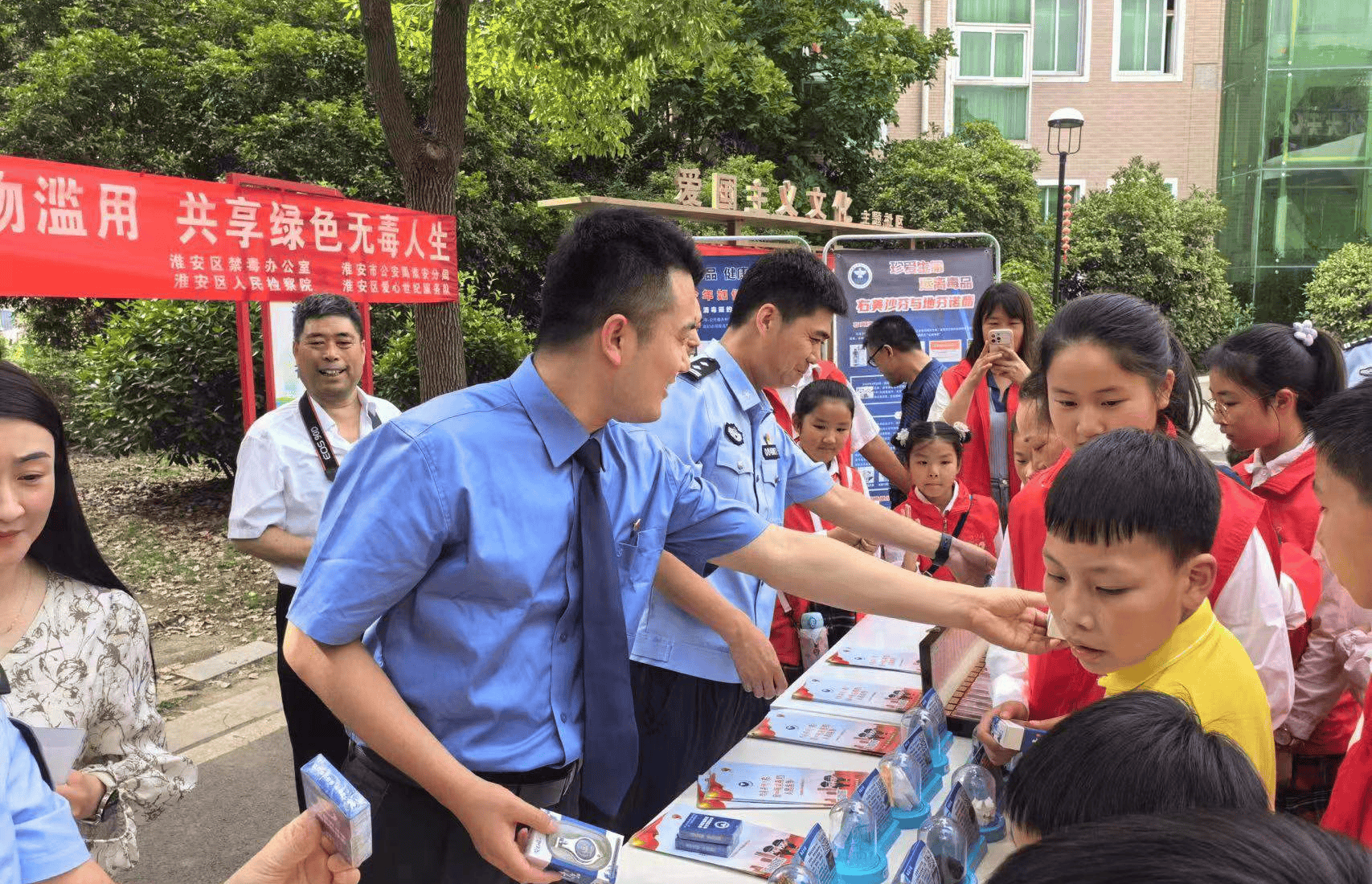 首先播放了由淮安区禁毒办录制的青少年禁毒宣传片和禁毒绘画优秀作品,并为获奖的同学进行了颁奖。然后组织参观了关天培生平事迹陈列馆。最后在 关天培路社区广场上,开展了丰富多彩的宣传活动,区公安分局的禁毒民警向社区居民,参加活动的学生及家长们展示现代毒品仿制品,小志愿者们向居民们发放禁毒宣传资料。