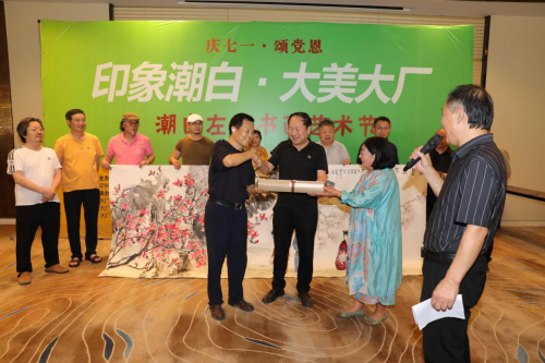 来自北京的著名书画家任之、鲍古风、陈硕发表了热情洋溢的讲话,表示一定要深入生活,展示潮白左岸美丽大厂的新形象、新成果,用手中画笔抒写新时代的大美篇章!书画家们还向艺术节赠送了书画作品,表达对大厂书画事业的美好祝愿。