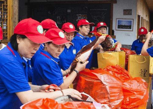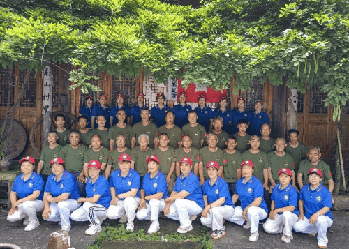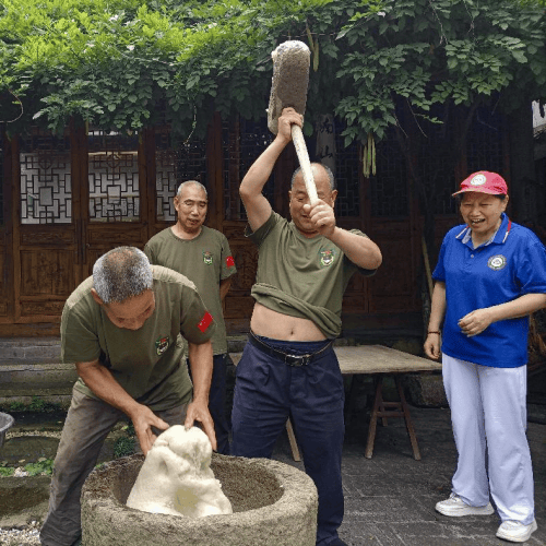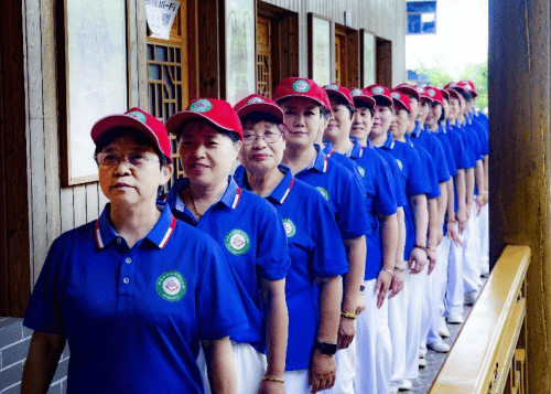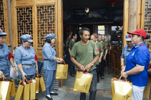 座谈会后,全体老兵换上了姐妹花义工赠送的退役军人特制服装,并一起到后院合影留念。姐妹花义工协会还为退役老兵准备了丰盛的午餐,早早让悠见南山民宿采购了新鲜的食材,请了一位高级厨师精心烹饪,还捣麻糍,真像过节一样隆重。姐妹花义工与南山村老兵及村干部,在“悠见南山民宿"宽畅别致优雅的餐厅里,大家纷纷举杯,提前庆祝建党建军节。餐后离席,姐妹花义工夹道相送,还给每位老兵送上一份过节礼物。相处仅有半天,分手依依不舍。