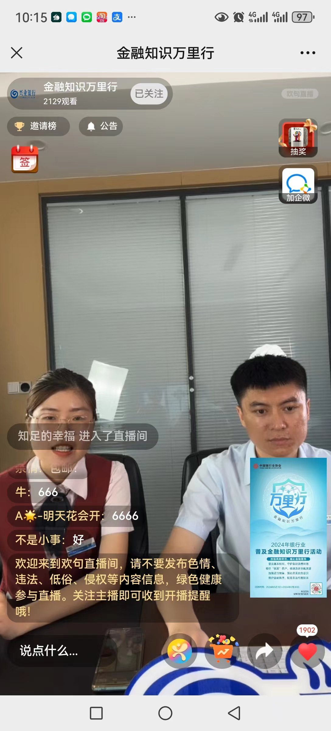 为切实履行社会责任,拓展金融教育受众面,深入推进2024年银行业普及金融知识万里行活动,近日,兴业银行淮安分行组织宣传骨干走进直播间举办了一场“加强风险防范 暖心金融服务”线上公众教育活动。