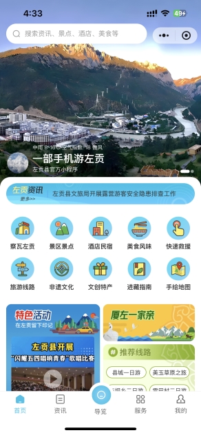线上新体验:一部手机游左贡 “一部手机游左贡”小程序不仅是左贡文旅官方宣传的展示平台,更是游客的贴心导游。从景区推荐到酒店民宿,从美食攻略到旅游线路,再到非遗文化,真正实现一部手机游左贡,吃喝玩乐,一键触达。值得一提的是,该系统为游客量身打造的三大贴心服务。 第一,智慧导览。手绘地图让全域景区一目了然,结合语音讲解功能,边听边游,深入了解每个景点的历史背景、文化内涵,极大地提升了游客的游览体验。 第二,进藏指南。对于初次进藏的游客来说,高原反应、气候变化等问题都是他们关心的重点。该系统提供了详尽的进藏指南,包括高原反应应对措施、气候条件分析、装备推荐等实用信息。这些指南能够帮助游客做好充分的准备,降低旅行风险。 第三,快速救援。系统贴心地为游客添加了便捷服务导航,常用联系方式一键拨打,快速获得帮助。这种贴心的服务让游客在享受旅行乐趣的同时,也能感受到安全保障。