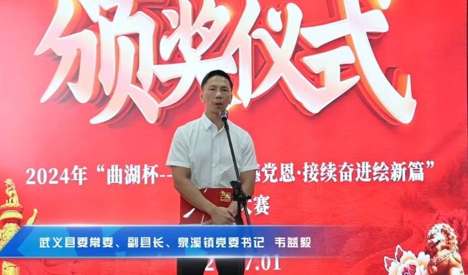 7月1日,2024年“曲湖杯·下山脱贫感党恩·接续奋进绘新篇”绘画大赛颁奖仪式,在武义县泉溪镇泉东村党群服务中心二楼隆重举行。县委常委、副县长、泉溪镇党委书记韦益毅出席颁奖仪式,并作重要讲话。