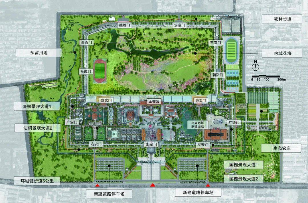 其中,位于外城中轴线一线经过全新翻修,焕发出新的光彩。城前广场新栽种52棵较大胸径银杏,构成两列行道树阵,绿树成荫亭亭如盖。 内外环公路